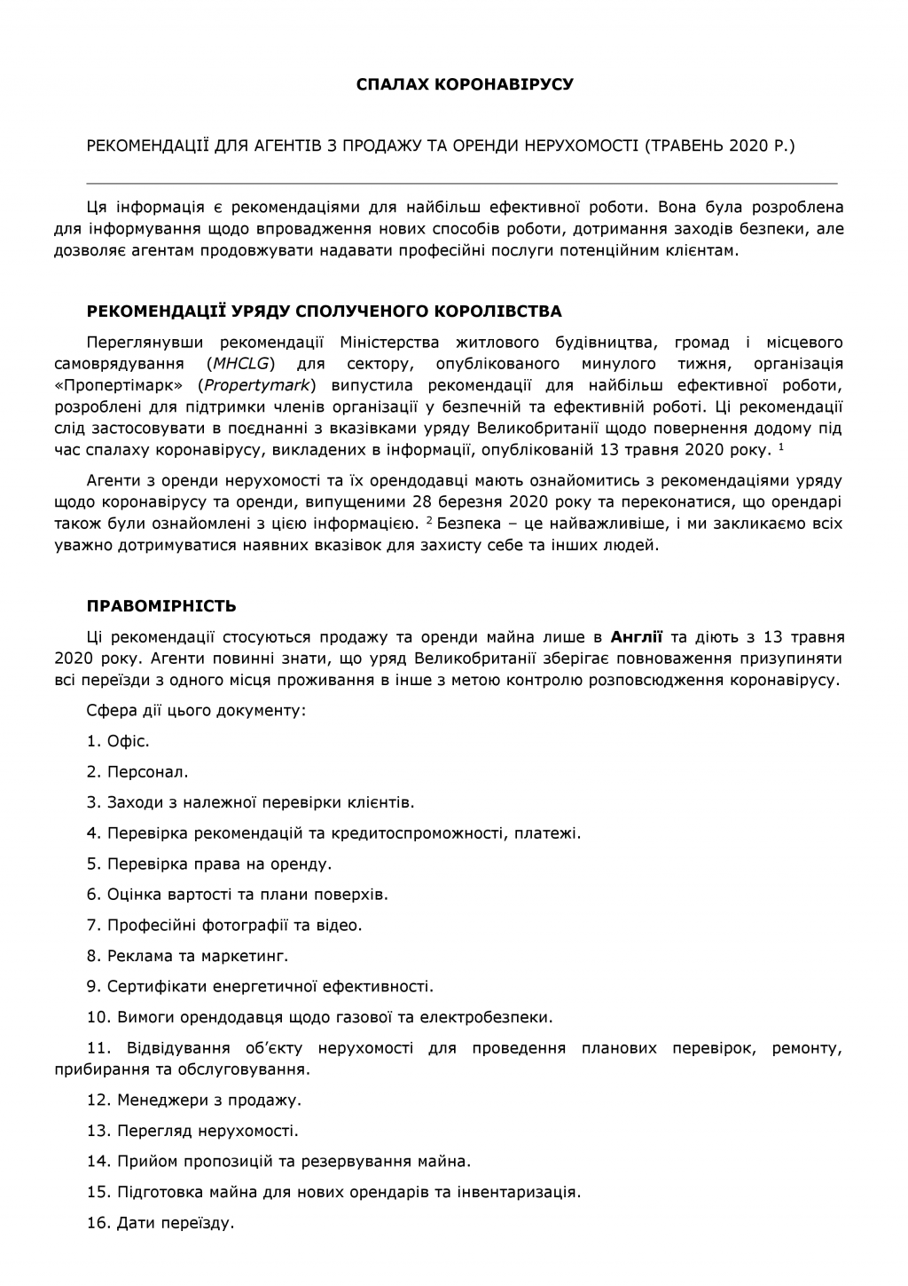 Асоціація фахівців з нерухомості (рієлторів) України в рамках асоційованого членства в Європейській асоціації професіоналів у сфері нерухомості (CEPI) направляє на ознайомлення та використання в роботі членами АФНУ рекомендації та інструкції по наданню послуг фахівцями сфери нерухомості різних країни в умовах дії карантинних заходів. Цього разу направляємо рекомендації, які були надані агентам з нерухомості в Англії. Необхідно зауважити, що такими рекомендаціями можна керуватися також при загостренні інших вірусних захворювань ( наприклад, грип, ОРВІ).