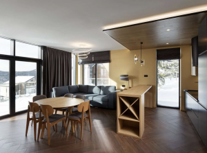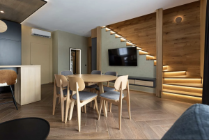- вітальня з розкладним диваном для двох, барними стільцями та обідньою зоною на 6 персон;