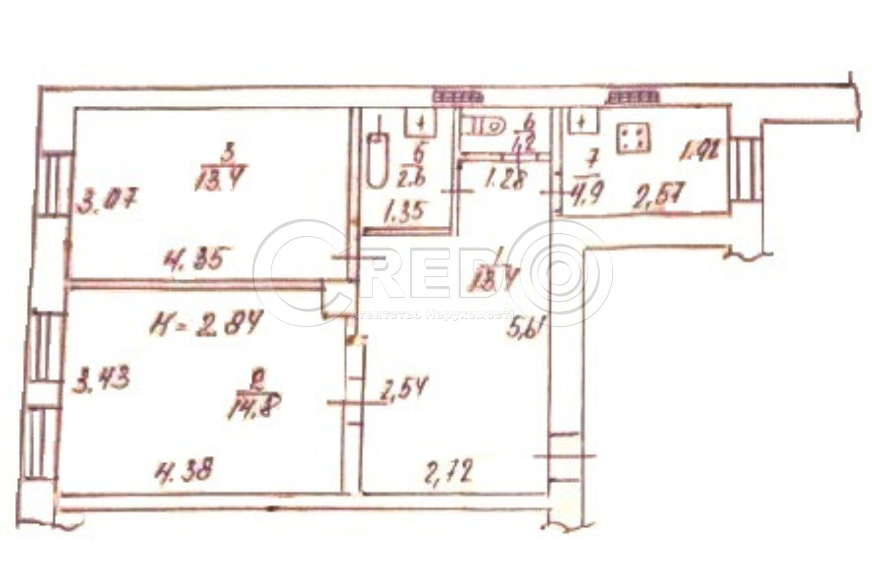 - Висота стелі 2.84м.