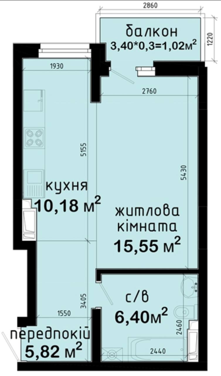 Балкон — фізичних 3,4 м² (облік — 1,02 м²)