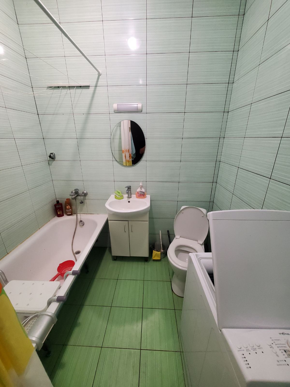 Санвузол з ванною, пральна машина, умивальник з дзеркалом.