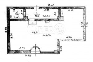 Планування об’єкту : - Загальна площа – 83.5кв.м., - Торгівельна зала 68.8кв.м., - кабінет, комора, санвузол - Висота стелі 3.00м