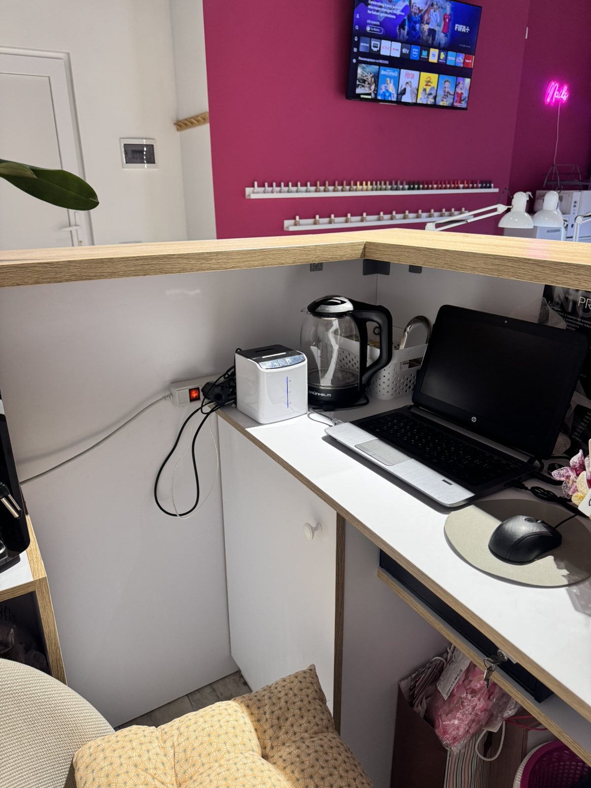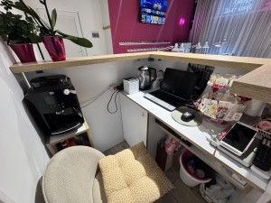 Також облаштована зона адміністратора: касовий апарат, ноутбук, кавова машина, усе необхідне для комфортної роботи та прийому клієнтів.