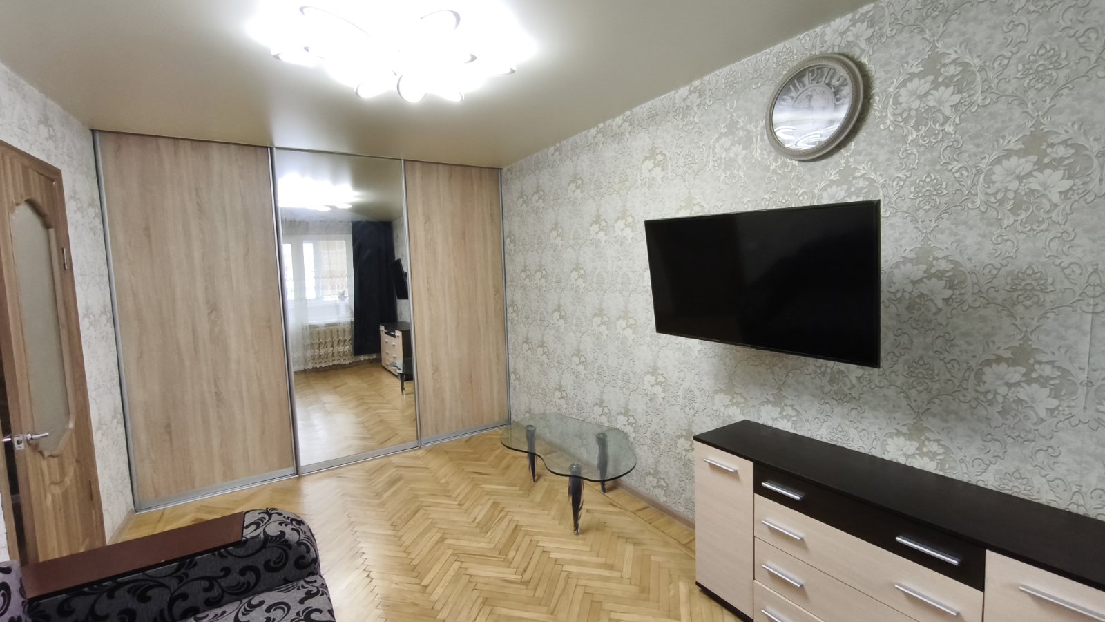 Великий балкон засклений і утеплений. У кімнаті відреставрований паркет.