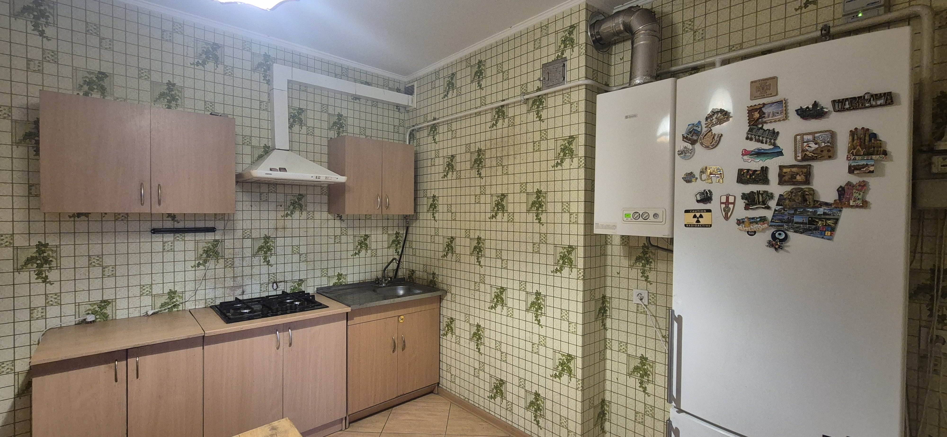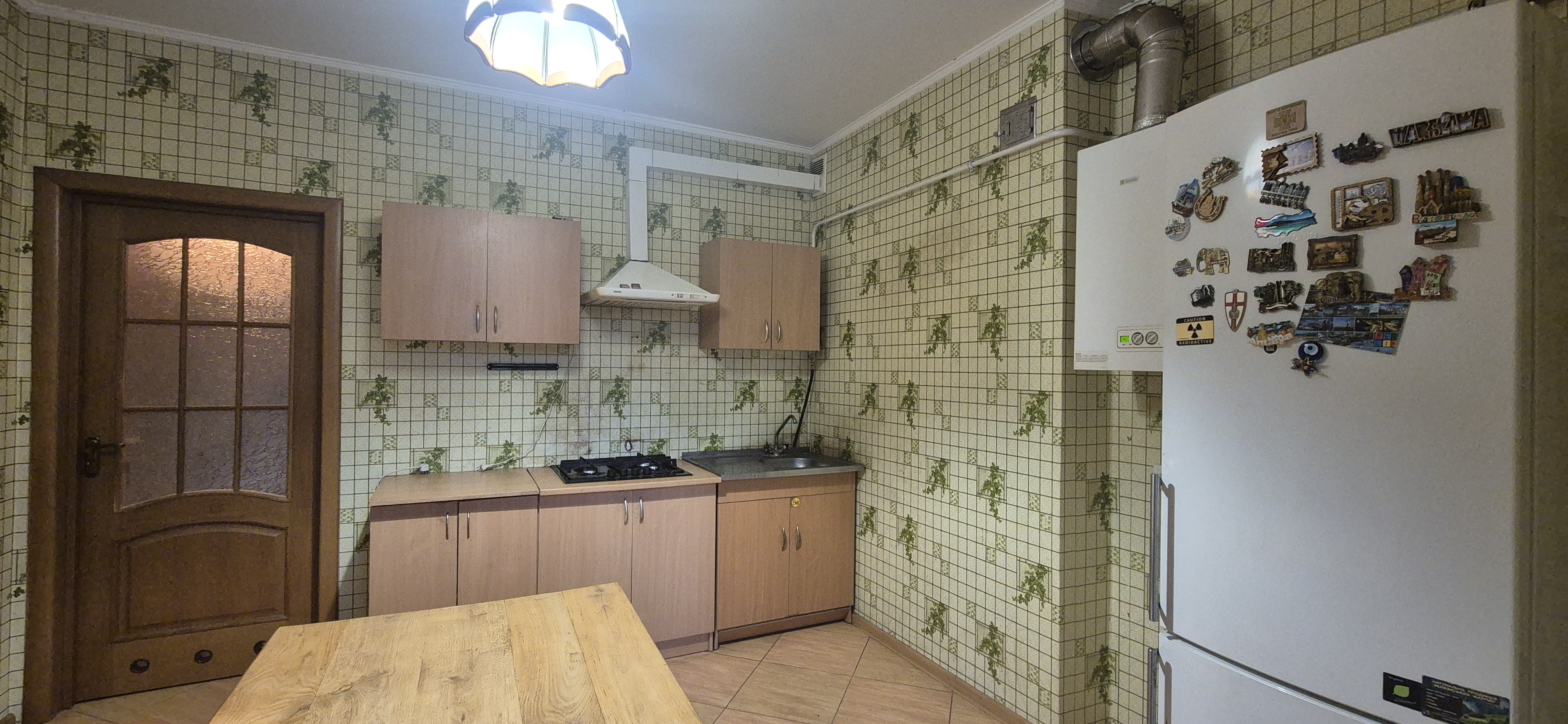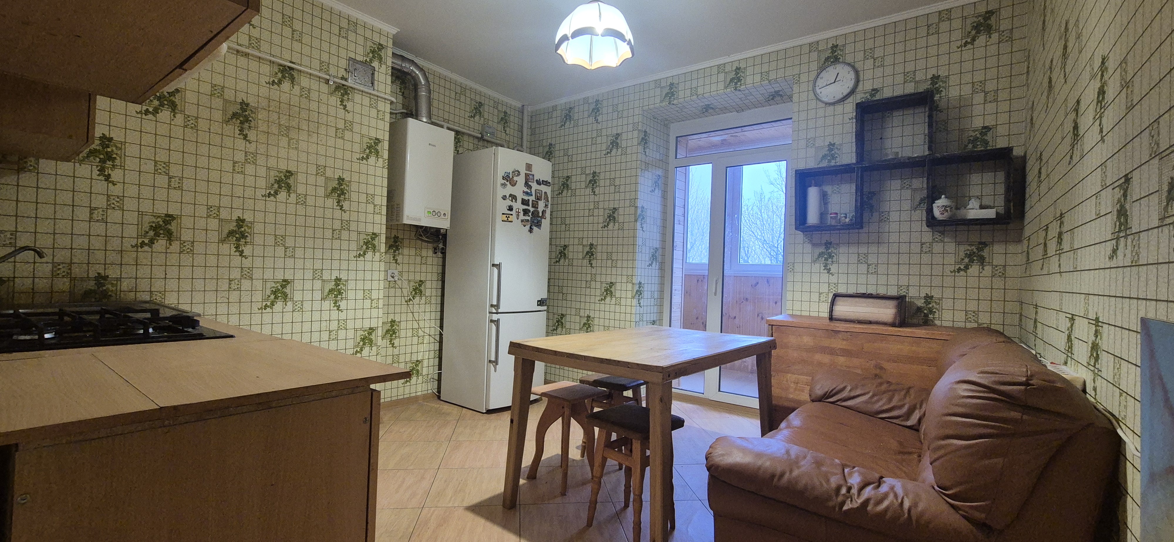 Кухня (вбудований гарнітур, газова поверхня, витяжка, мийка, холодильник, газовий котел, обідній стіл, диван)