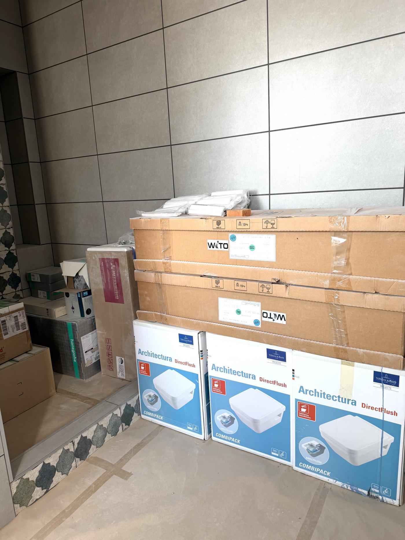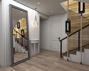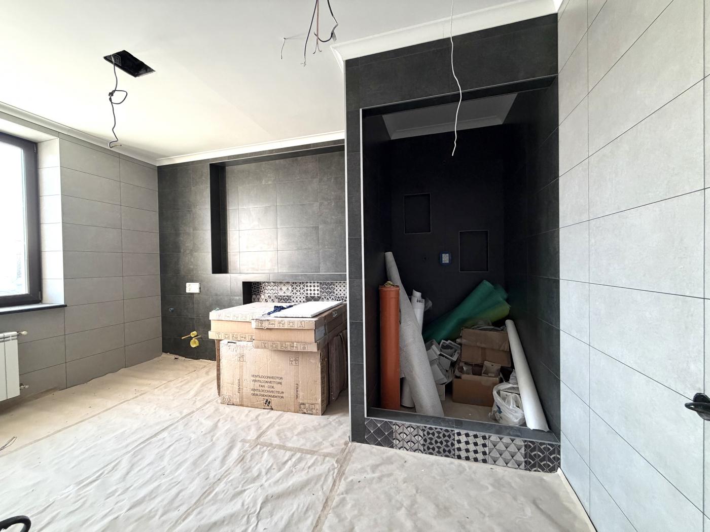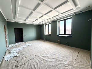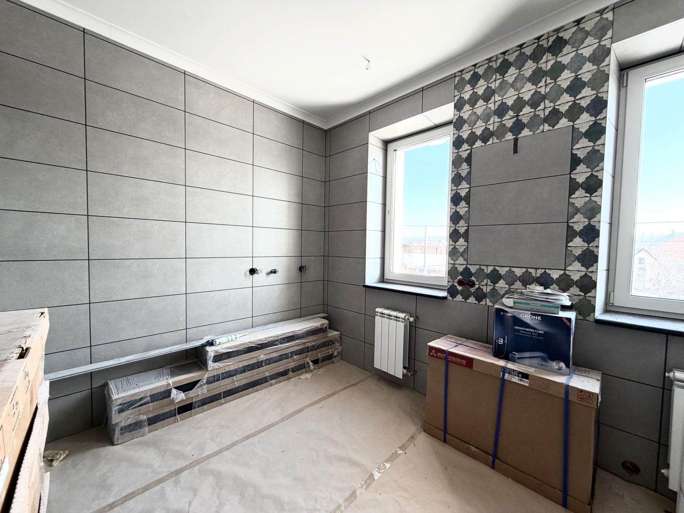 Перший поверх: повністю покладена плитка, пофарбовані стіни по всьому будинку. У санвузлі, окрім теплої підлоги, виконані теплі стіни (аналог теплої підлоги по стінах); у санвузлах є вся сантехніка — залишилось лише встановити.