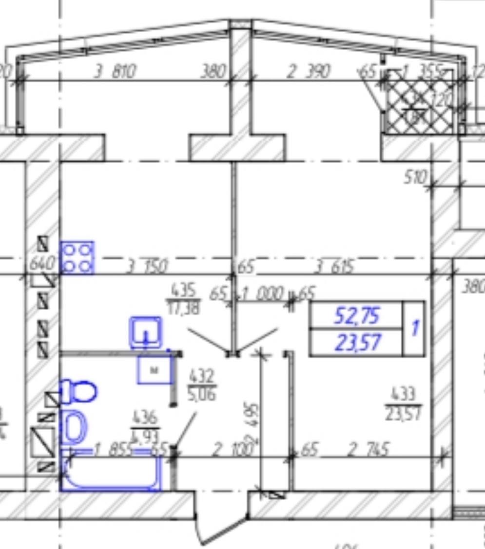 Площа 52,75/23,57/17,38 м кв
