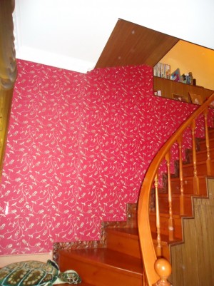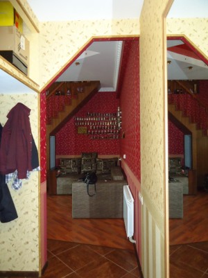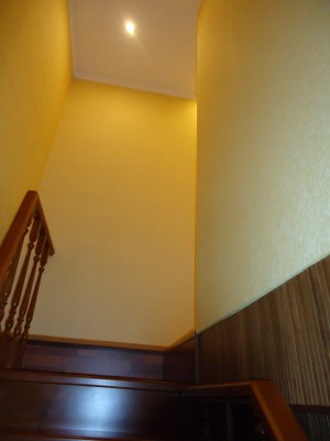 Между уровнями установлена удобная деревянная лестница с перилами.