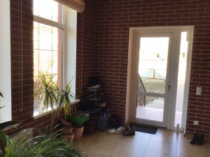 построен из газобетона,утеплён пенополиуретаном,облицован красным кирпичом