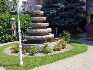 Идеальный ландшафтный дизайн, много вечнозеленых растений, пруд с живыми рыбами, а так же фонтан. Беседка с летней кухней, винный погреб.