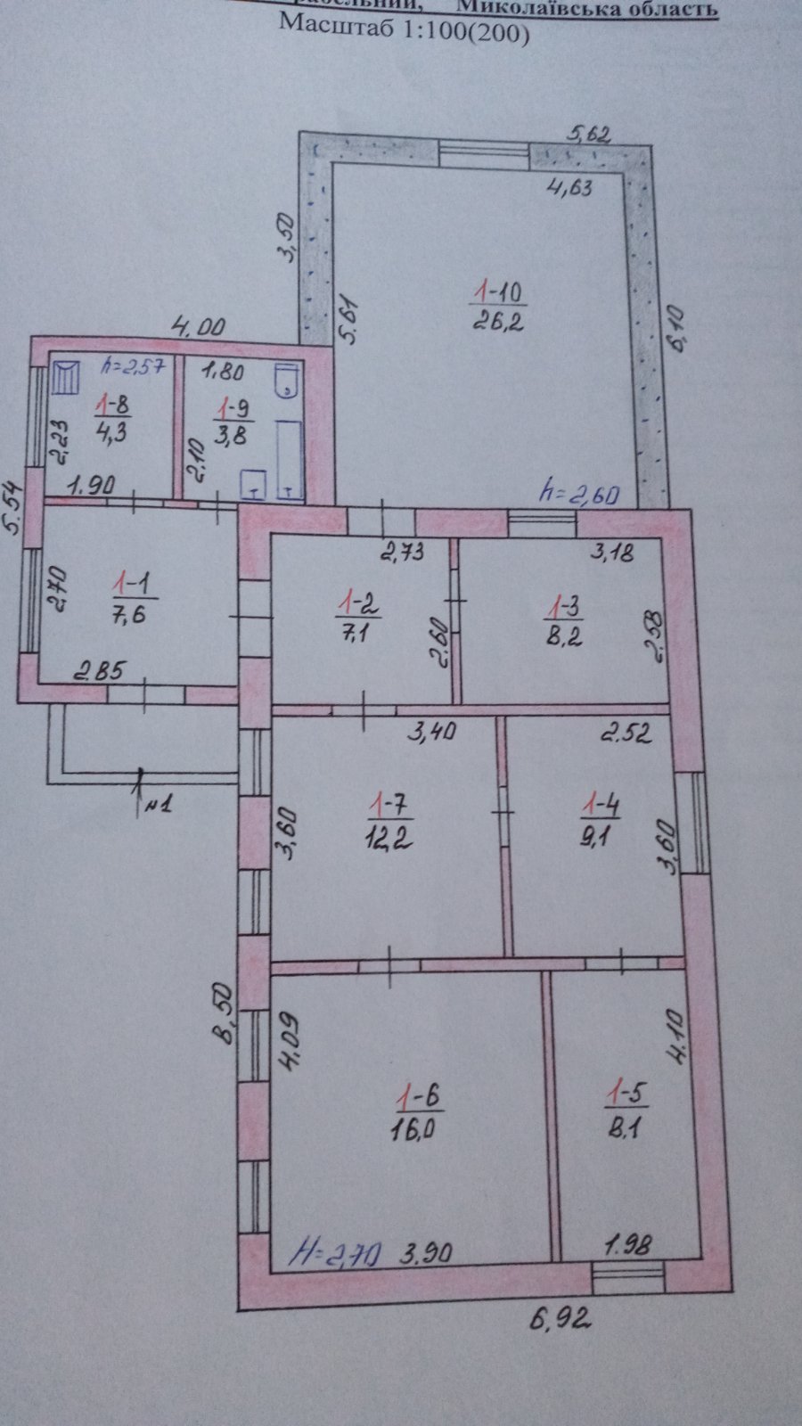 По дому: жилые комнаты - 8,2м2, 9,1м2, 8.1м2, 16,0м2, гостинная 12,2м2, котельная 4,3м2, санузел 3,8м2, кухня 26,0м2.