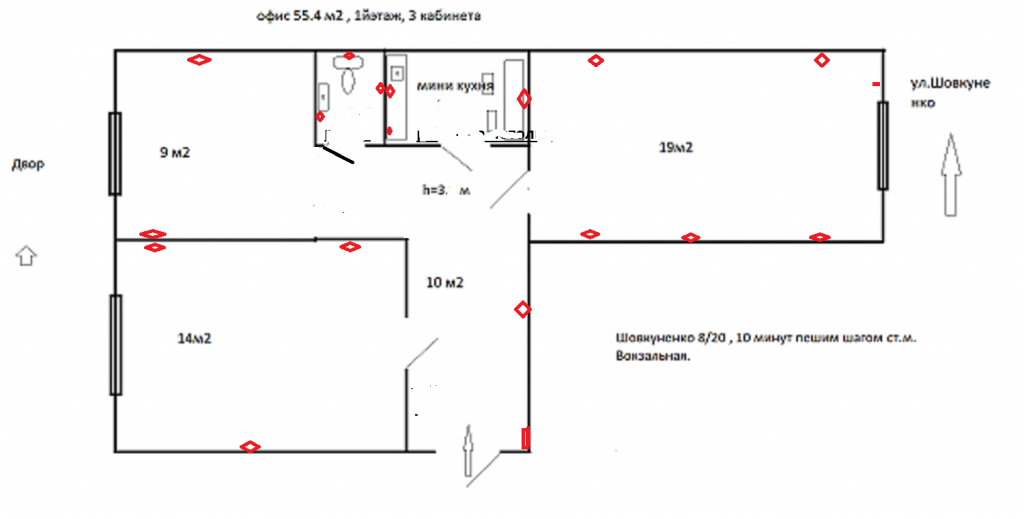 Без комиссии для Арендатора ! угол Шовкуненко и Богдановская .Помещение под офис , нотариус , салон , клинику . Дом фасадный " Сталинка". Помещение 56 кв.м., на первом этаже. Три раздельных кабинета (19+14+9,5) мини кухня , санузел , высота потолков 3 м . Парадное чистое, , двор просторный что позволяет парковать ваши автомобили и автомобили ваших клиентов . В доме много организаций и офисов. Хорошо развитая социальная и транспортная инфраструктура. метро Вокзальная 7-10 минут пешком. Цена 20000 + коммунальные.