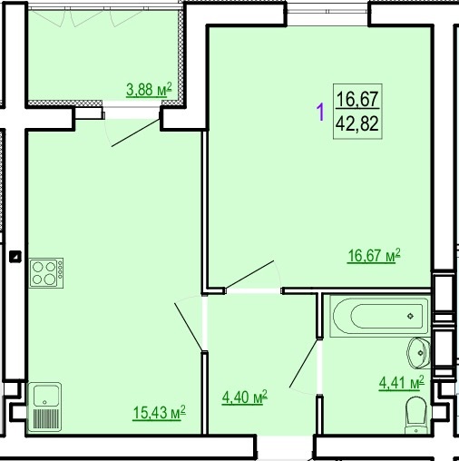 Загальна площа: 42.82 кв.м