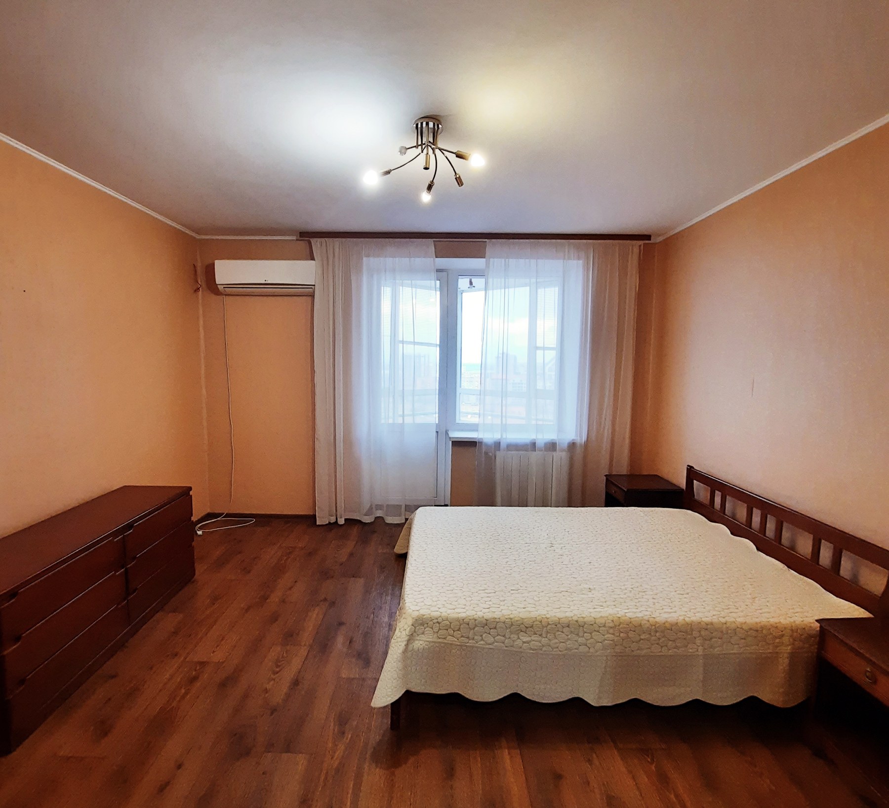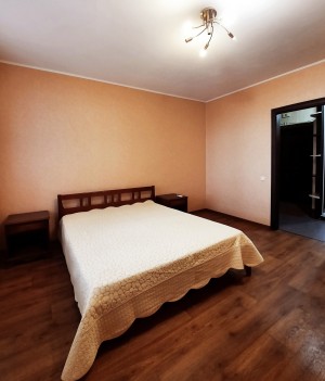 В спальне 17 кв. м – двуспальная кровать, две прикроватные тумбочки, большая деревянная тумба под