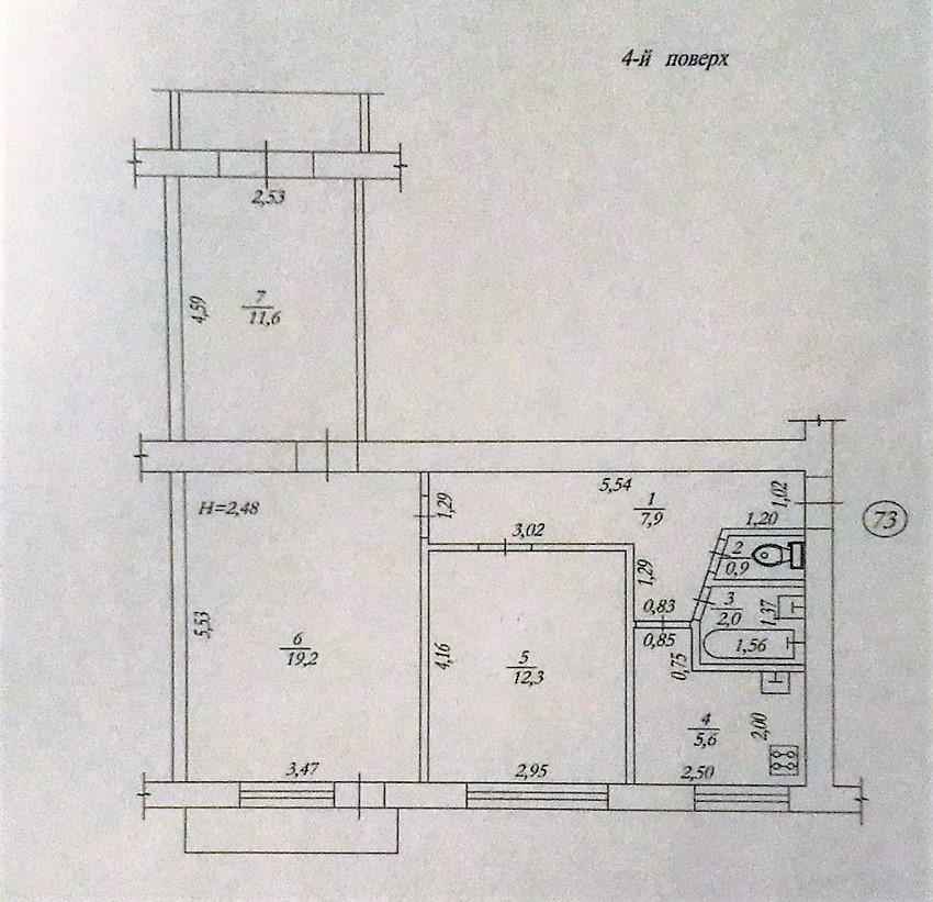 Загальна площа – 61,6 кв.м: кухня – 5,6 кв.м, дві окремі кімнати, одна – прохідна, санвузол роздільний.