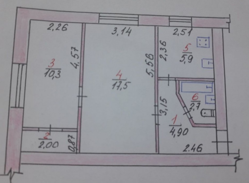 Общая - 43 кв. м, жилая - 27.8 кв. м (10.3 кв + 17.5 кв), кухня - 6 кв. м