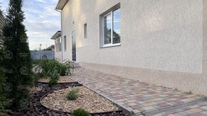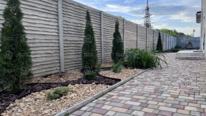 Огороджений секційним бетонним парканом. Двір викладено тротуарною плиткою.