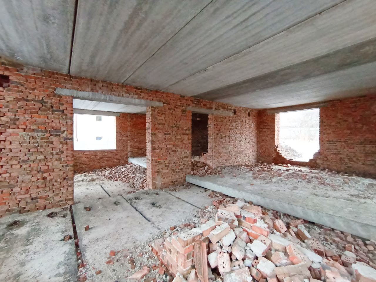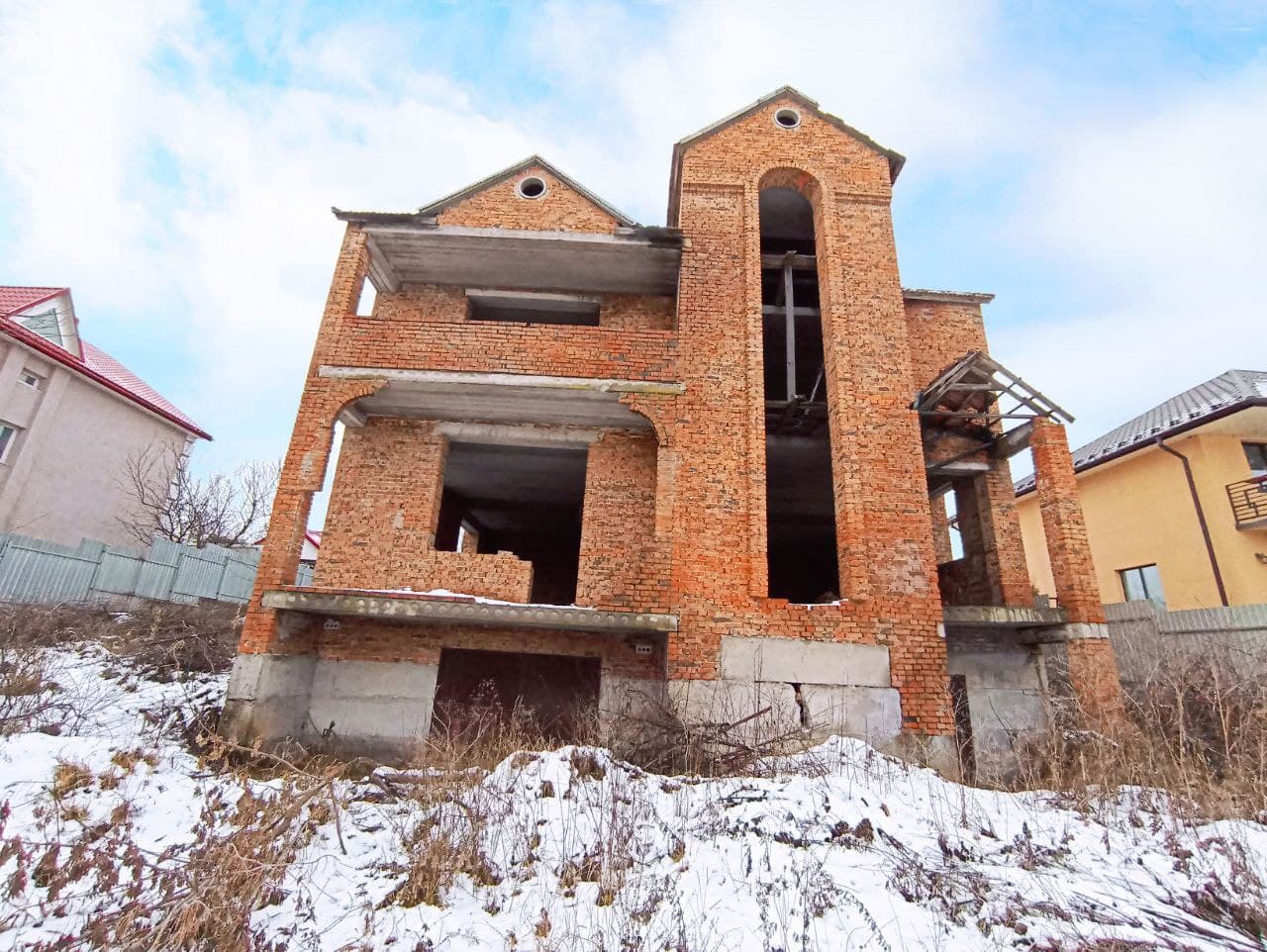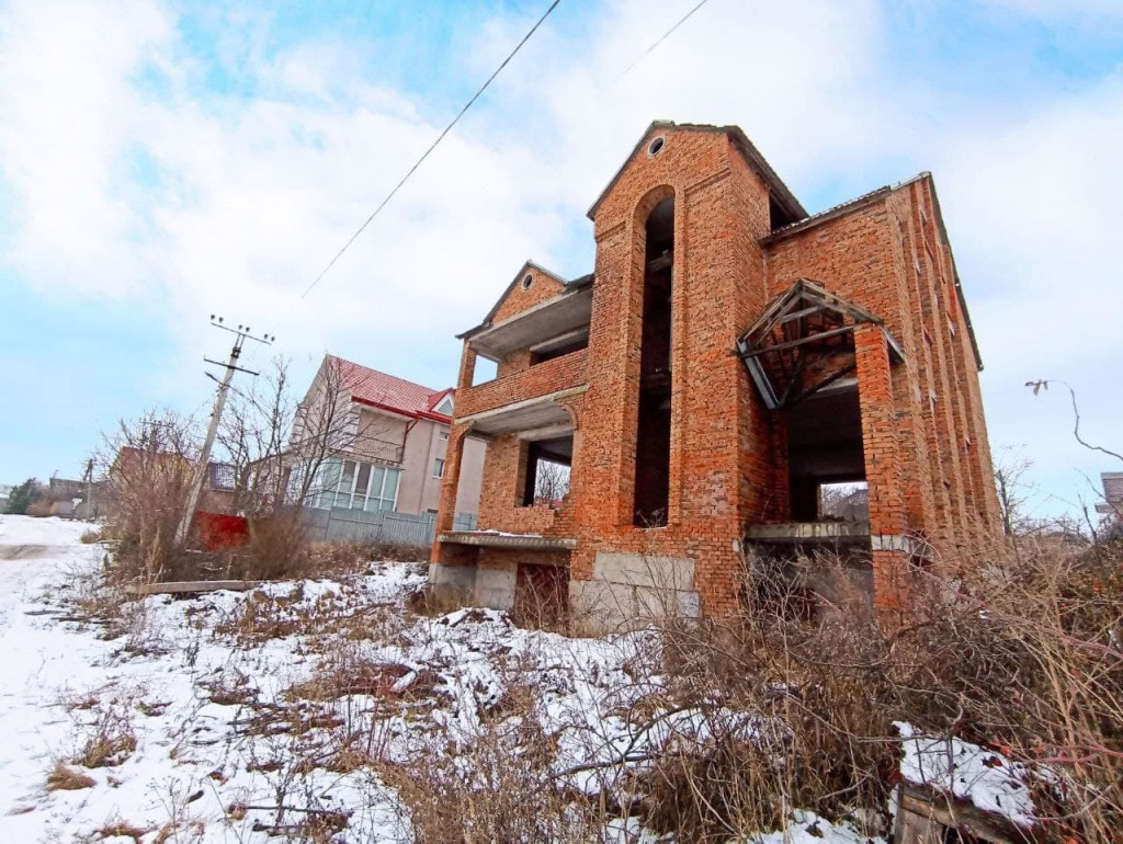 Коробка: 240м2 (два повноцінних поверхи, цокольний і мансардний в подарунок). Незавершене будівництво (документи є). Вільне планування.