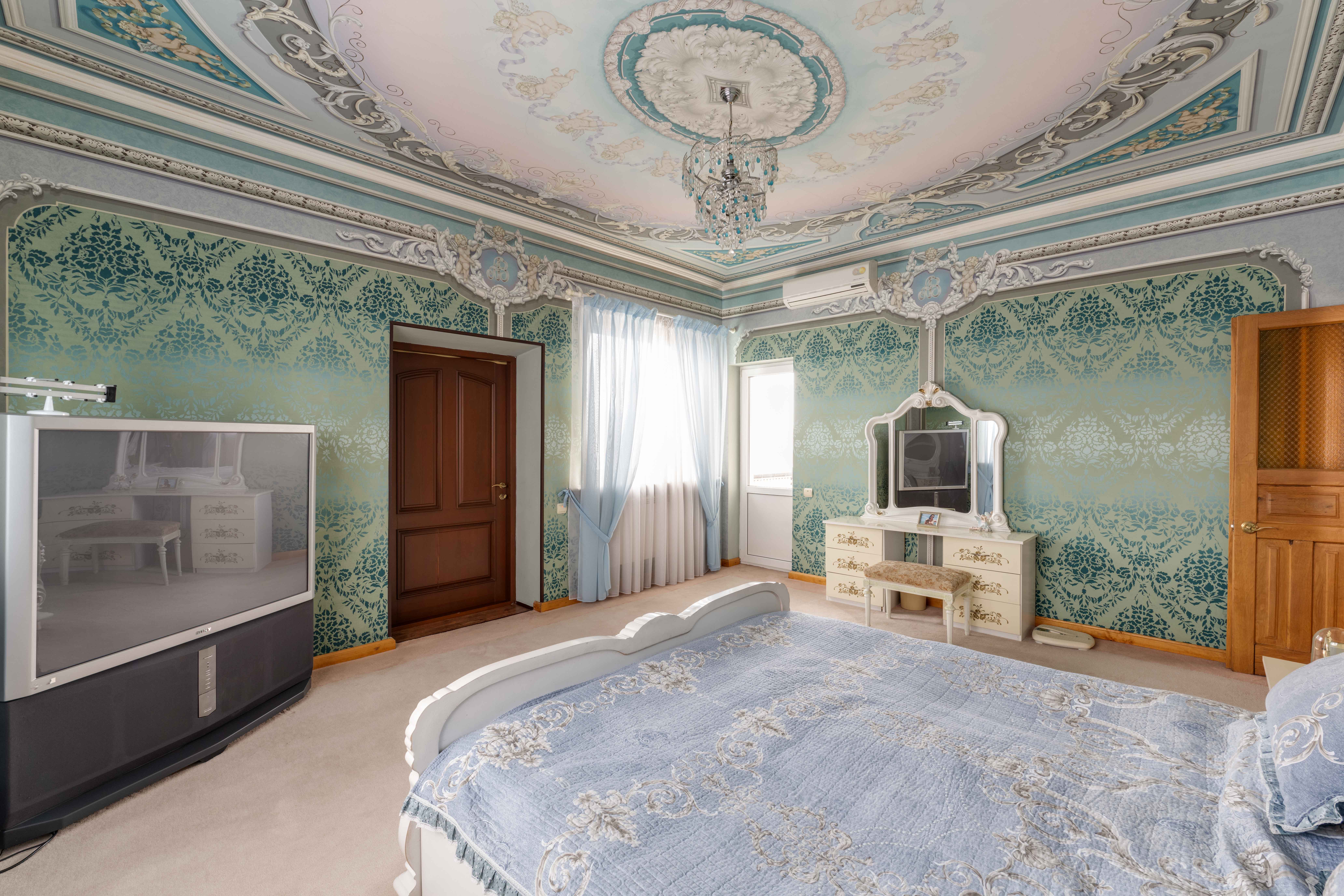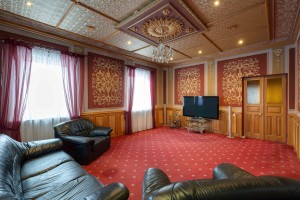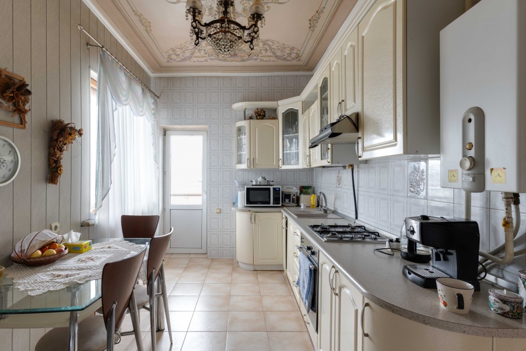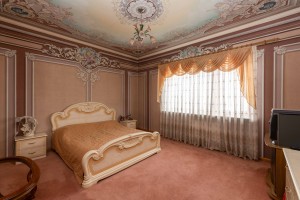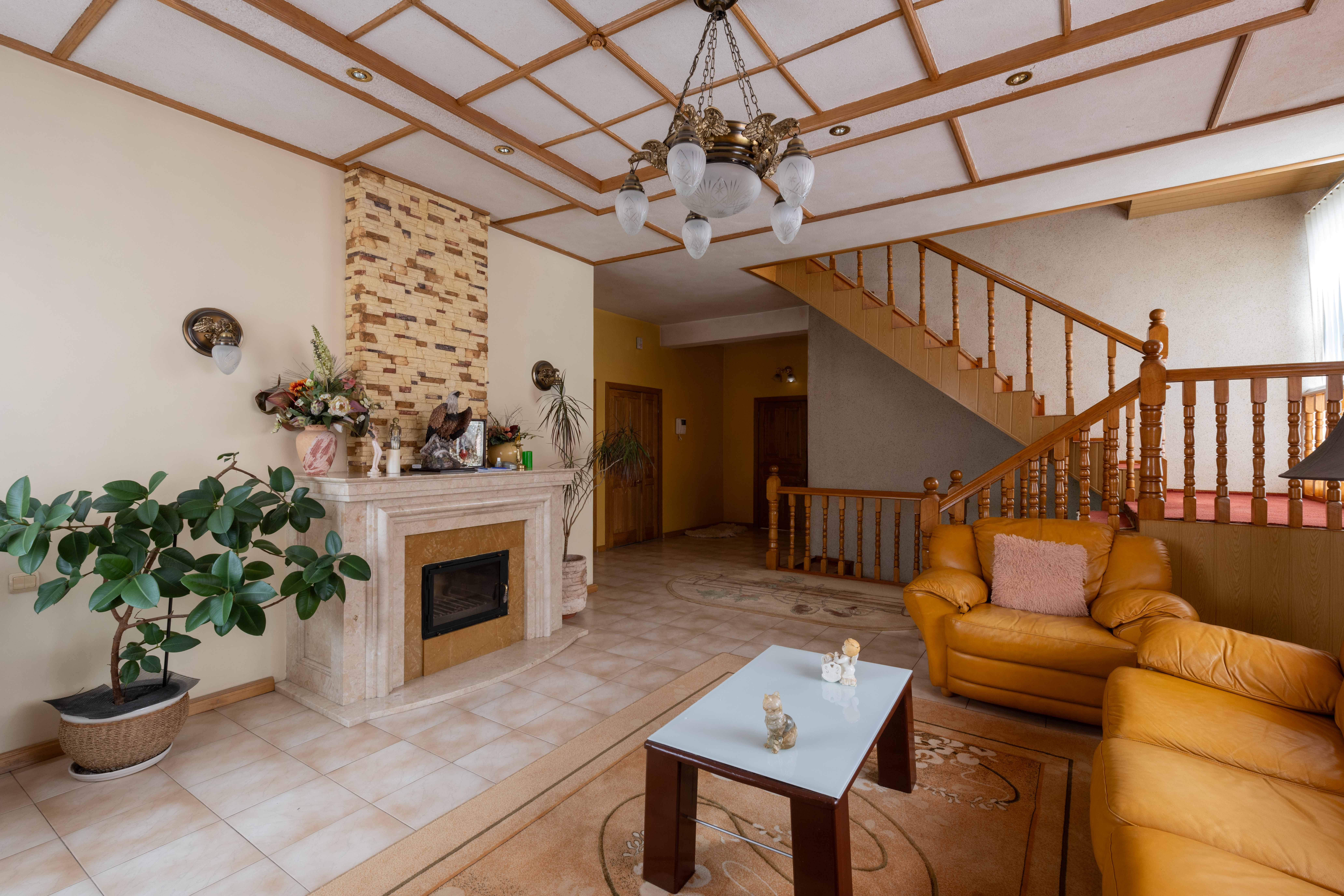 Скрізь плитка, у вітальні камін з мармуру, деревяні елементи на стелі та авторський розпис. Італійський гарнітур, паркетна дошка з натурального дерева.