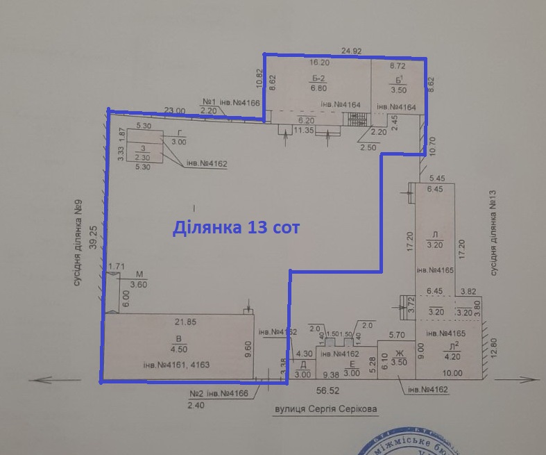 Загальна площа будівель 498 кв.м. У тому числі двоповерхова офісна будівля в незадовільному стані, площа офісів становить: на першому поверсі 153 кв. м, на другому поверсі 110 кв. м Електрична потужність 15 кВт. Е підключення водопостачання і можливість підключення до центральної каналізації. Земельна ділянка 13 соток, договір оренди до 2027 года. Окремий в'їзд, асфальтовани під'їздні путі. До проспекту Соборний відстань 50 м.