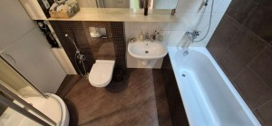 Санвузол суміщений з ванною та душовою кабіною.