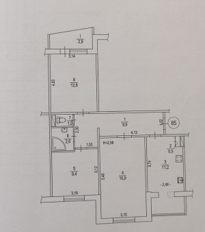 Загальна площа-89.1кв.м, житлова-49.4кв.м, (10.1/12.8/9.4/17.1), Н-2.65м, кухня-9.7кв.м, коридор-11.9кв.м, комора-2.7кв. , туалет-1.0кв.м,…